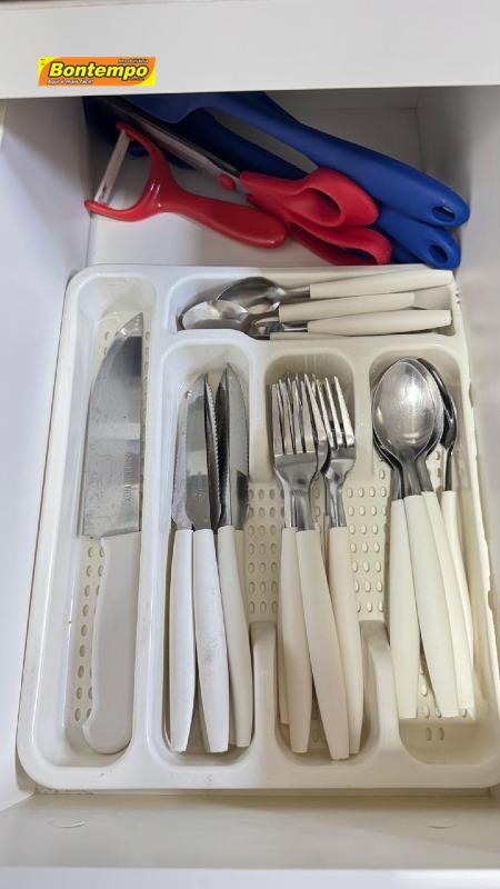 Cozinha completa com utensílios e eletrodomésticos (geladeira, micro-ondas, cooktop, utensílios, forno elétrico).