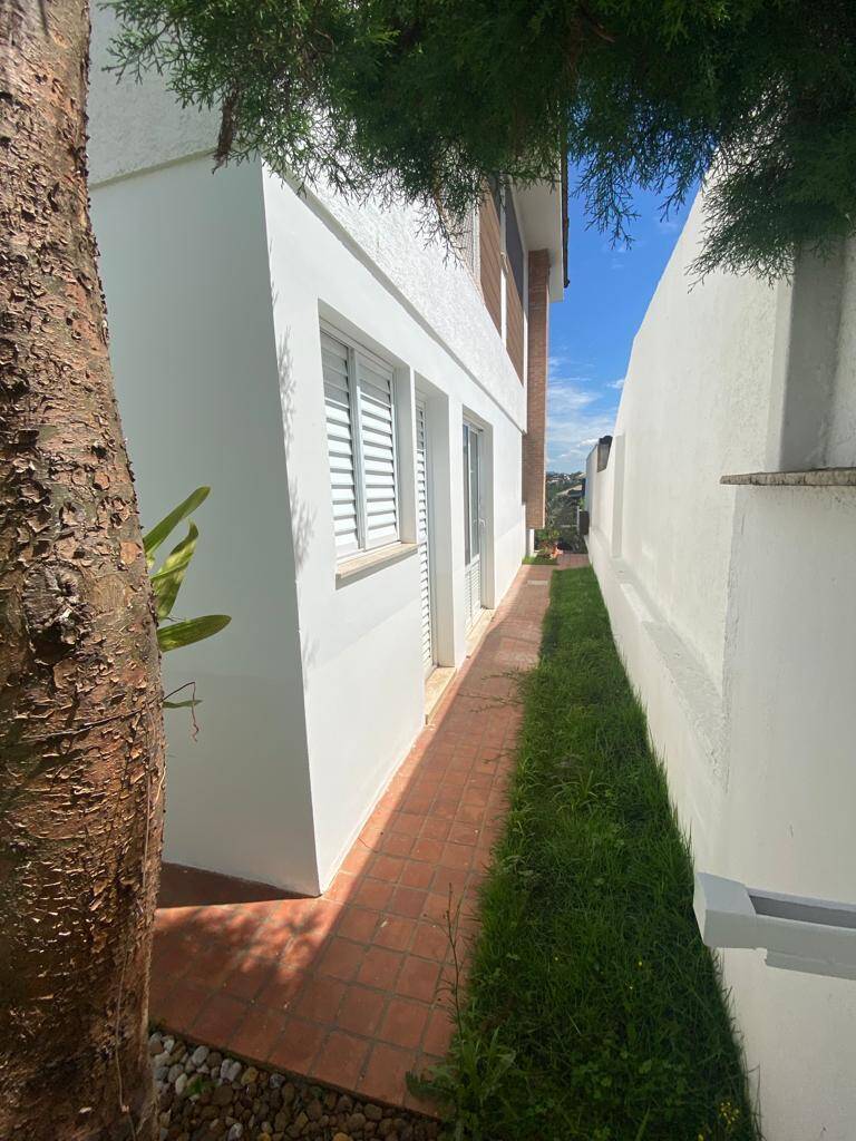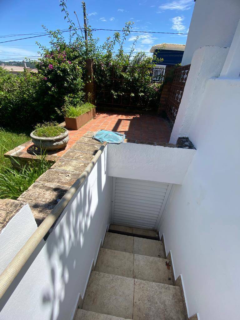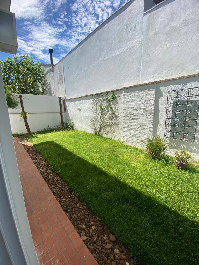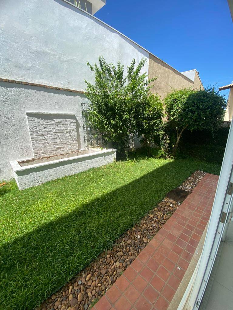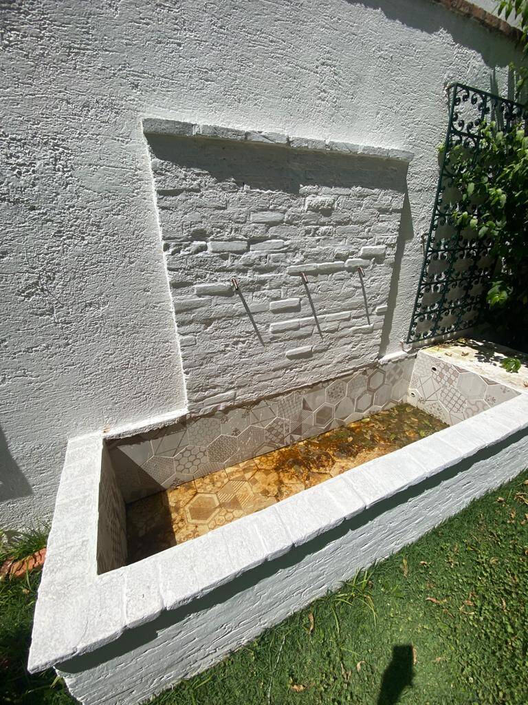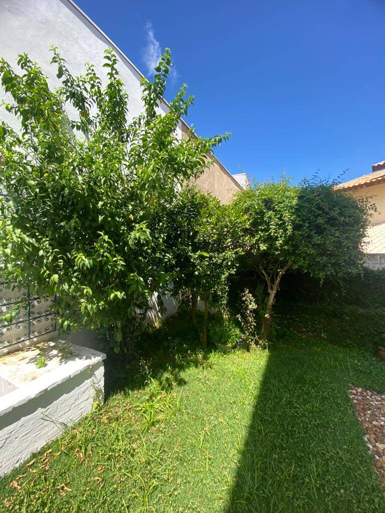 Jardim, pomar e fonte d’água no quintal dos fundos, com acesso por corredor lateral.